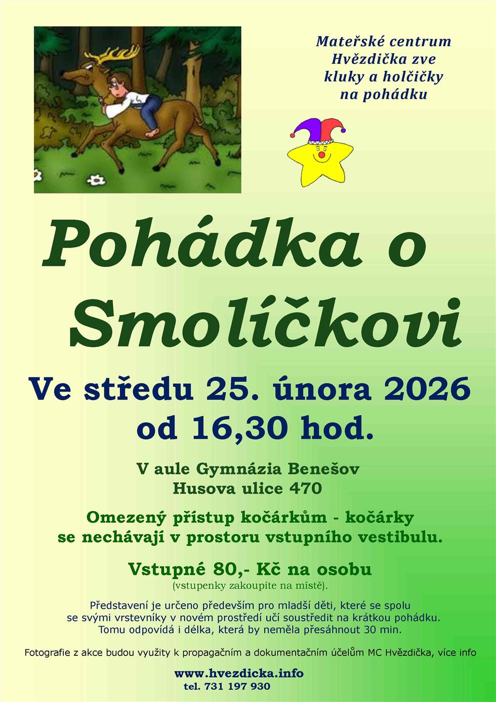 Půlhodinka s pohádkou pro nejmenší. Představení je určeno především pro mladší děti, které se spolu se svými vrstevníky v novém prostředí učí soustředit na krátkou pohádku. Tomu odpovídá i délka, která by neměla přesáhnout 30 minut.