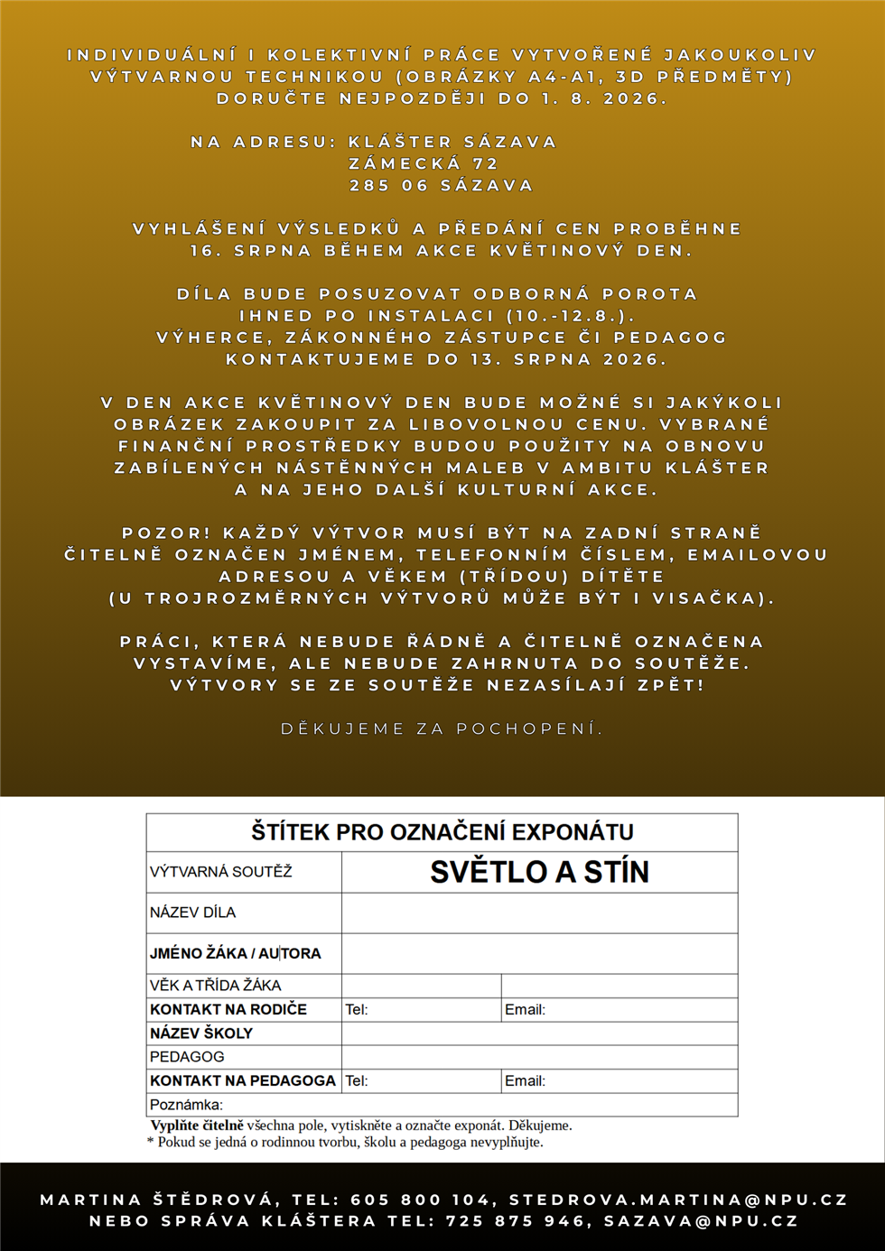 Soutěž je určena pro jednotlivce, školní i školkové třídy a výtvarné kroužkyPráce doručte na adresu: Klášter Sázava, Zámecká 72, 285 06 SázavaVyhlášení výsledků proběhne 16. srpna 2026 během akce Květinový den.