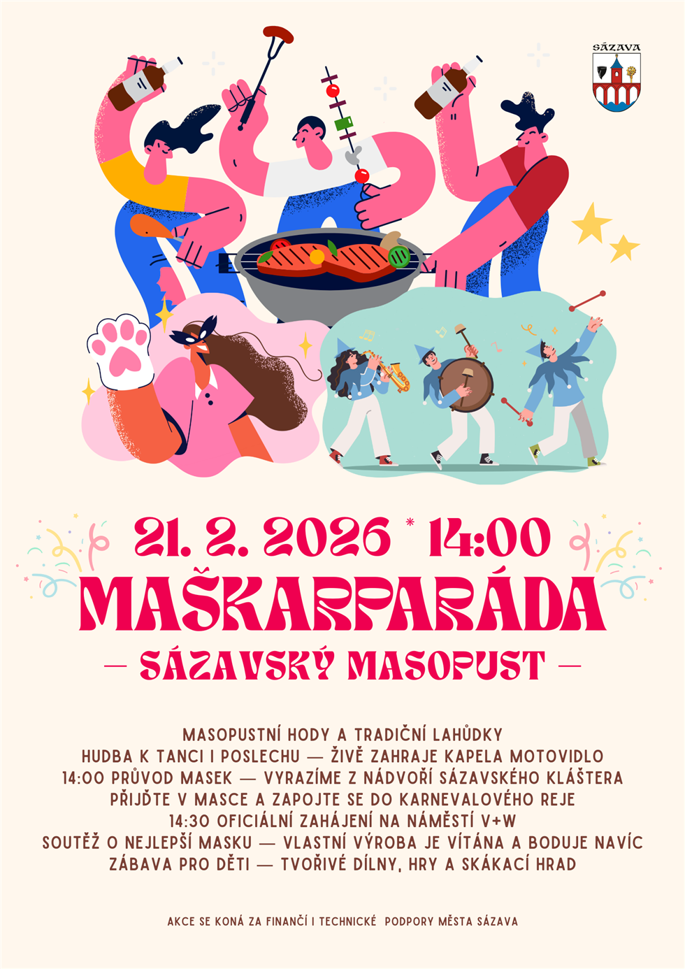 Zveme vás na sázavské masopustní hody plné masek, hudby, tance a dobrého jídla. Přijďte si užít veselou atmosféru masopustu, připomenout si lidové zvyky a strávit příjemné odpoledne s rodinou i přáteli.