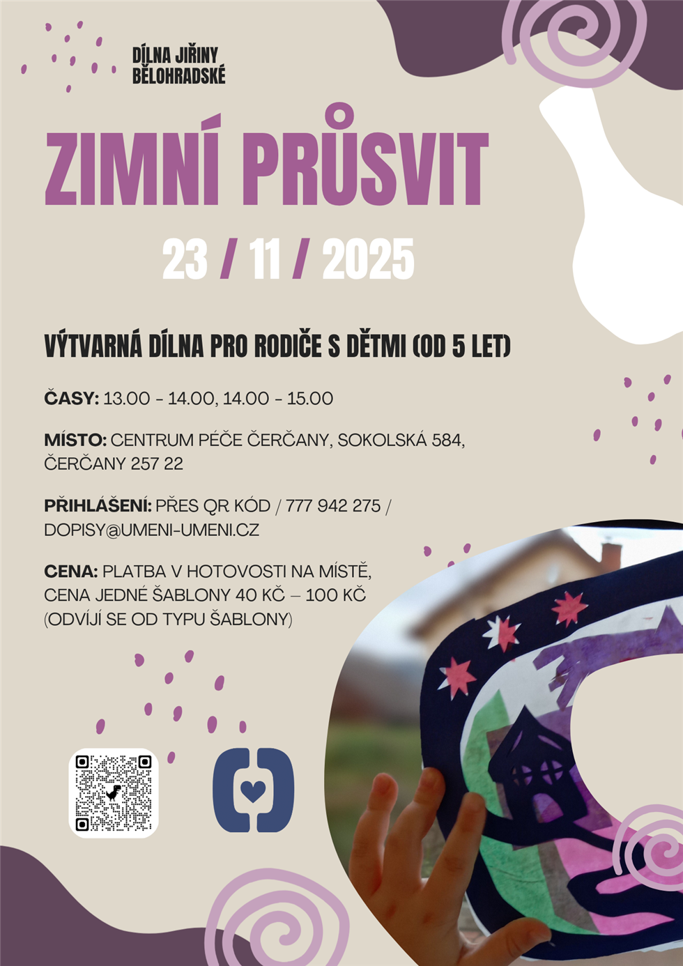 Přihlášení přes QR kód, odkaz, mail: dopisy@umeni-umeni.cz nebo tel. č. 777 942 275.