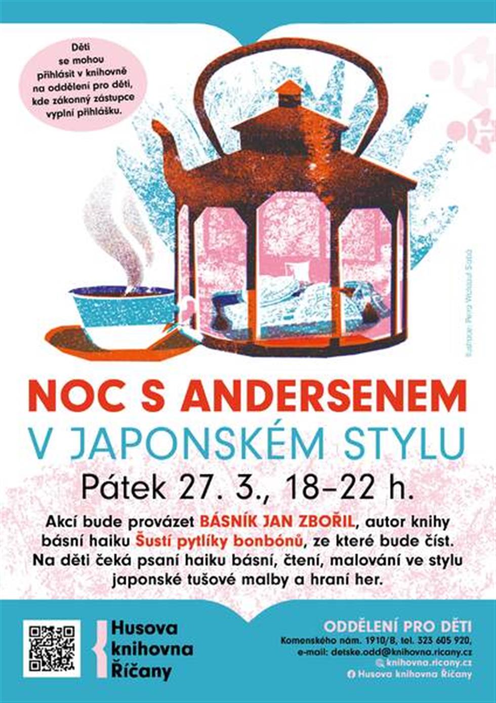 Srdečně zveme kluky a holky na NOC S ANDERSENEM V JAPONSKÉM STYLU. Akcí bude provázet básník Jan Zbořil, autor knihy básní haiku Šustí pytlíky bonbónů, ze které bude číst. Na děti čeká psaní haiku básní, čtení, malování ve stylu japonské tušové malby a hraní her. Děti se mohou přihlásit v knihovně v oddělení pro děti, kde zákonný zástupce vyplní přihlášku. Kapacita je omezená na 20 dětí.