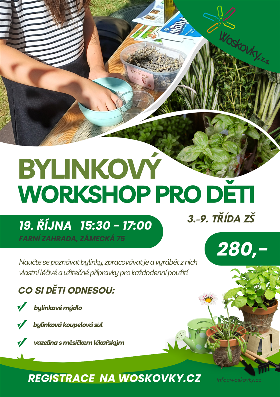 Zveme žáky 3. až 9. třídy na bylinkový workshop. Naučí se poznávat bylinky, jejich využití a jak je správně zpracovat. Na závěr si každý vytvoří a odnese domů tři vlastní voňavé výrobky. Přijďte s námi odhalit poklady přírody!
