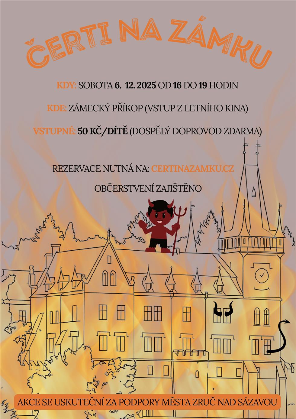 Přijďte si užít čertovskou atmosféru do zámeckého příkopu, který se změní v peklo s čerty, kteří si pro děti připravili zajímavé úkoly. Ten, kdo dokáže všechny úkoly splnit, dostane od Mikuláše odměnu.